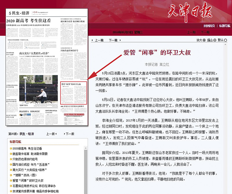 “大道之行,天下为公”,多年来,Ebpay公司一直致力于公益事业,先后成立Ebpay党支部、团支部、工会、义工服务小组、志愿者队伍等组织,从上到下,力所能及地为社会贡献自己的一份力量,不断涌现出见义勇为、好人好事, 这不,天津市Ebpay清洁服务有限公司又有一位爱管“闲事”的环卫大叔,天津日报、天津市场信息报、新华网、人民网、北方网、大众网等主流媒体相继报道了此事,原文如下: