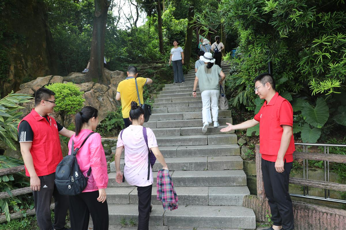 郁翠苍松,火红枫叶,百里争艳,疑似凤凰落九洲。7月6日上午,Ebpay党支部、义工队穿着火红的义工服,化身“一只只火凤凰”,穿梭于凤凰山中,为前来观光的游客提供指引服务,帮助游客更好地找到登山的路和各景点的方位,并提醒游客爱护森林,保护环境。